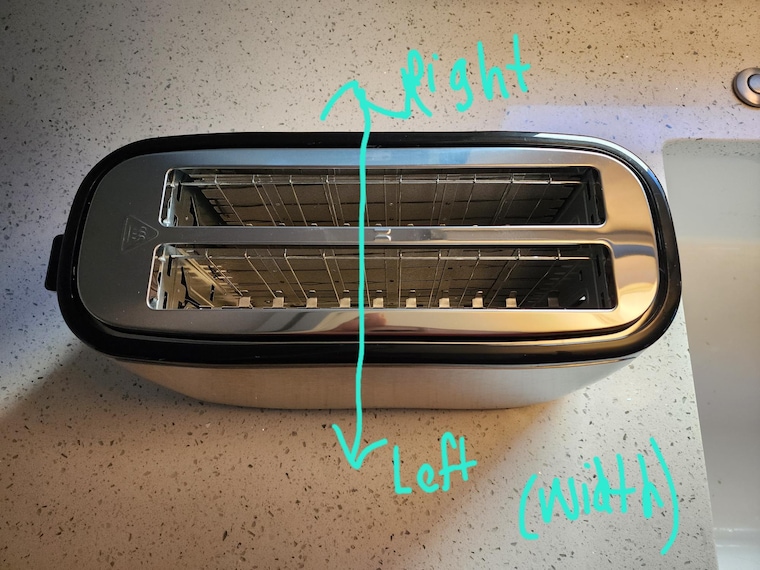 The width is measured from left to right. Toaster Huggee covers are designed to drape over 1-2 inches on each side.