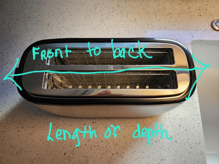The length or depth is from front to back and is usually about the length of the toaster slots.