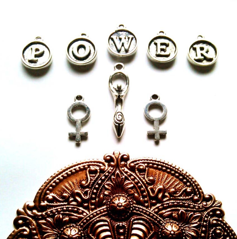 Alphabet, Fertility And Female Symbol Charms With Antique Copper Stamping.