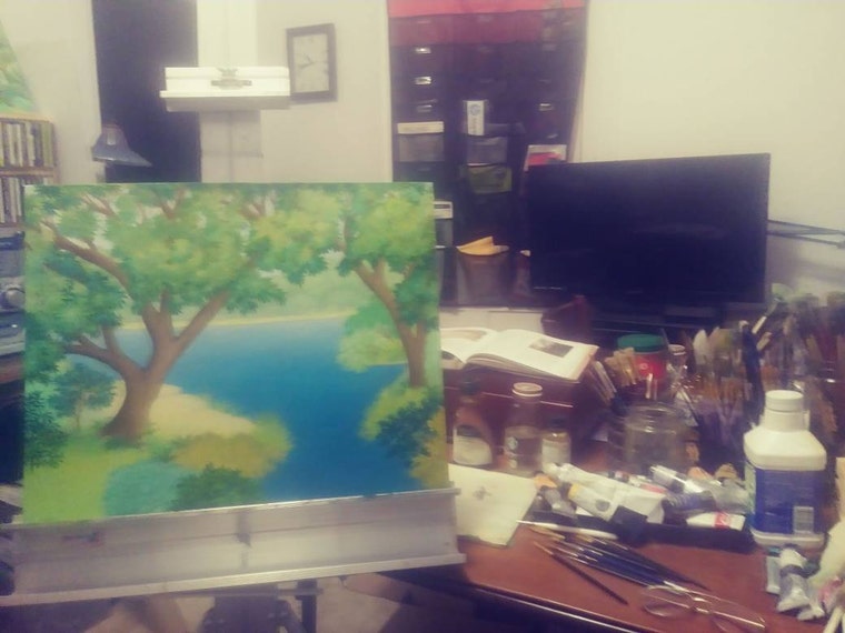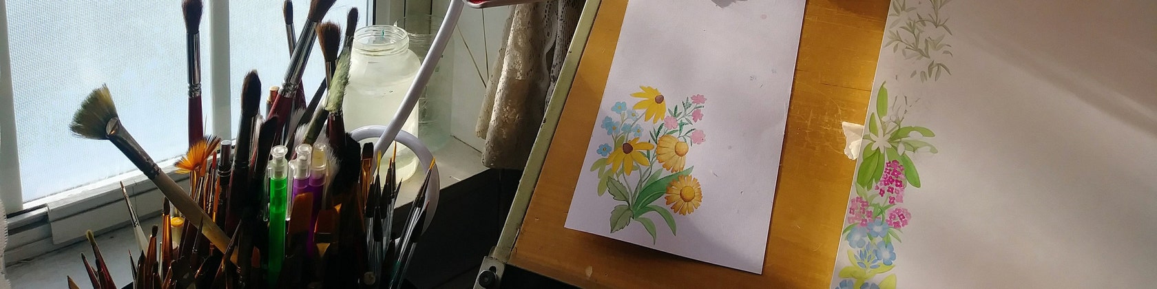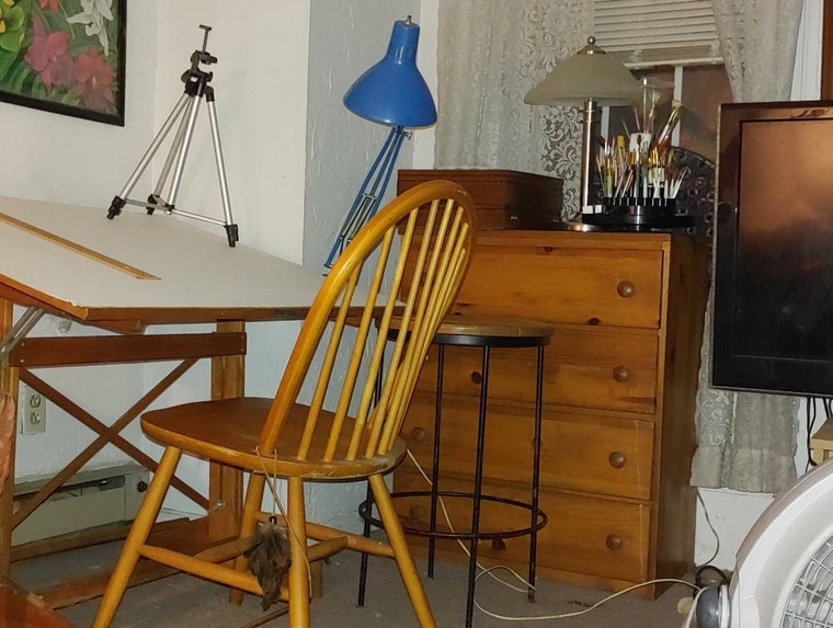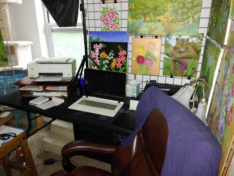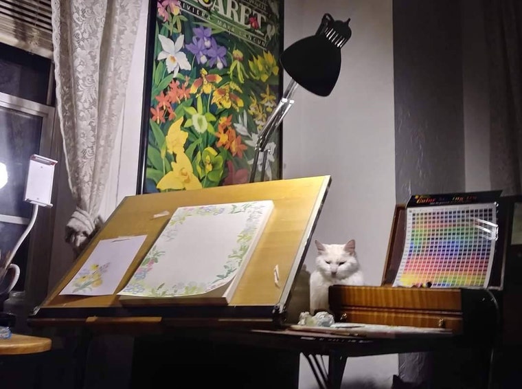 This is where I do my ink and watercolor based artwork. My cat Matisse is always there to supervise!