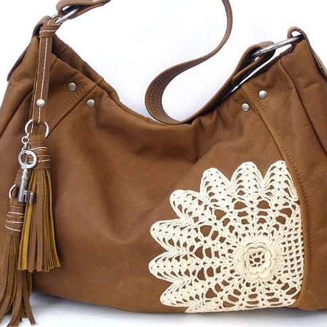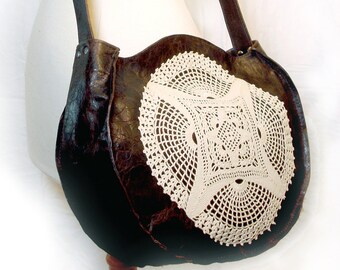 Leather Hobo Bag with Tassels, Vintage Crochet Lace Doily and Antique Key - Extra Large Boho Purse - MADE TO ORDER