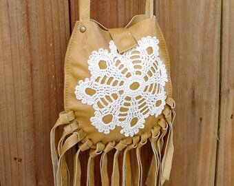 SALE - Tan Leather Boho Crossbody Bag with Fringe, Vintage Crochet Lace Doily and Skeleton Key - Caramel Hippie Gypset Purse