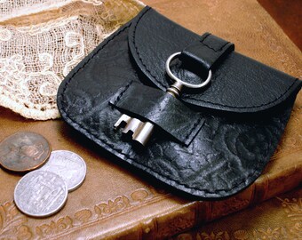 Black Leather Coin Purse with Snap and Antique Key Closure - Black Leather Change Purse - Black Leather Coin Pouch with Embossed Roses