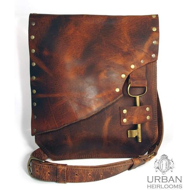 Rustic Brown Leather Messenger Bag with Antique Skeleton Key - Large MADE to ORDER - Rocker Biker Steampunk Goth
