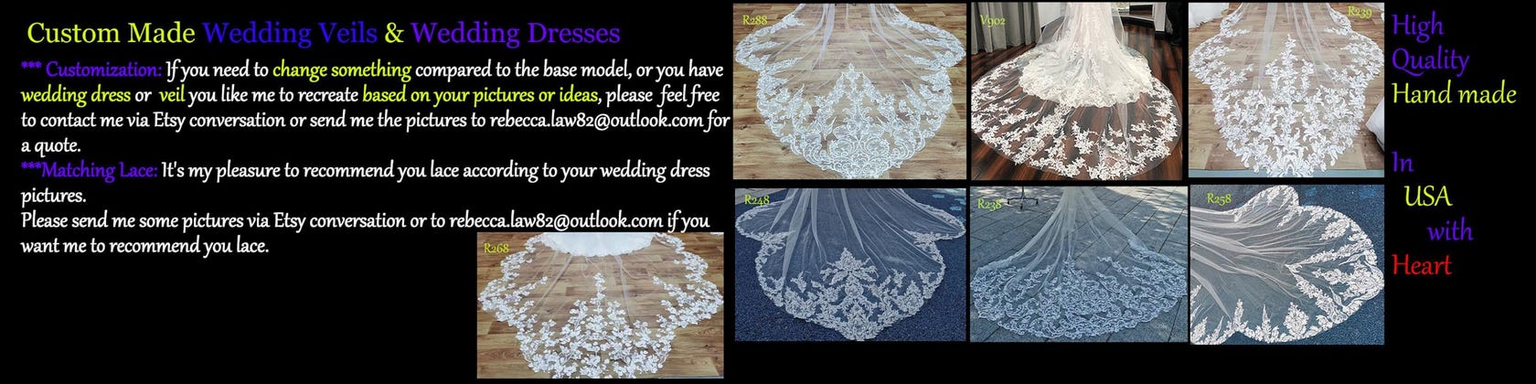 I can custom-made the veils to desired size, color and lace. If you don’t find a style you are looking for in my shop, I have the ability to make some changes according to your special requirements. It’s my honor to help you to bring out your beauty and individuality.