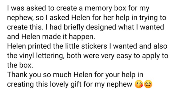 5 out of 5 starsI messaged Helen to talk about the vinyl lettering and she was a great help with advising sizing and fonts etc. I loved how they turned out, the came super quick and were so easy to apply!! I’m sure I’ll be back for more!!