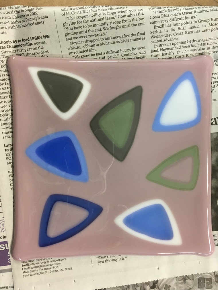 Glass is fused flat, the decorative triangles that were stacked have fused into the base layer. -