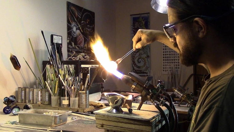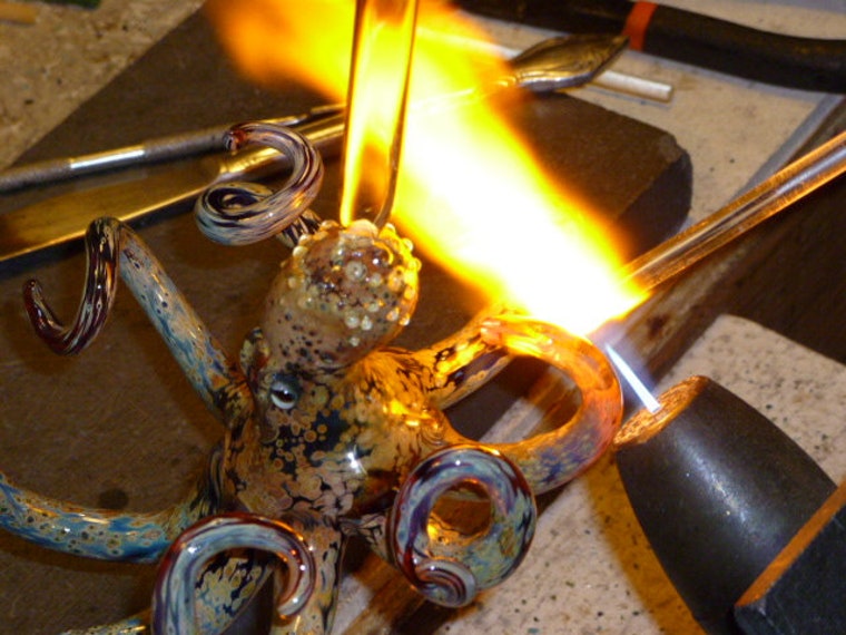 Lampworking or Flameworking is the art of manipulating hot glass with a torch. The glass is melted inches away from the artist's face in a torch that can reach 4,500 degrees F. Because the glass is heated form a cold state there is no need for a crucible and larger kilns, so the studio can be small and built at home.