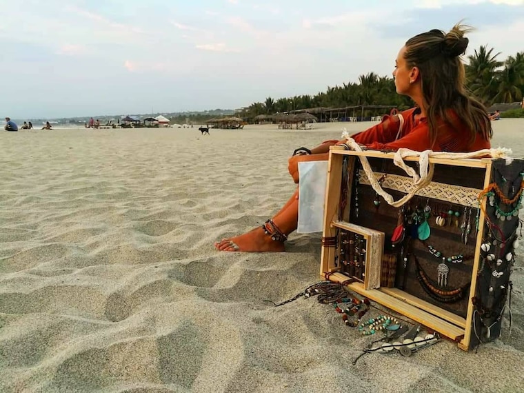 Más adelante, cuando ya tenía la cabeza llena de trenzas y estaba surfeando feliz en Bali, otra chica surfista se enamoró de mis trenzas y me preguntó si podía hacerle una. Y así empezó todo. La amiga de su amiga también quería una, luego la amiga de una amiga. Así que decidí venderlas. Después decidí probar qué más podía hacer con esta técnica de macramé. Y así comencé a hacer pulseras y collares y todo lo que se me ocurriera. Mi novio y yo comenzamos a vender las baratijas en la playa, más por diversión y para recuperar todo el dinero que gastaba en hilos y cuentas.