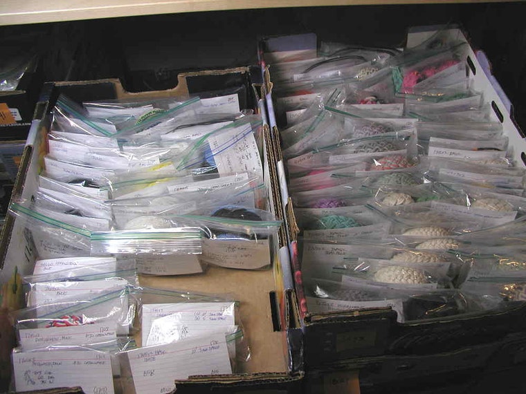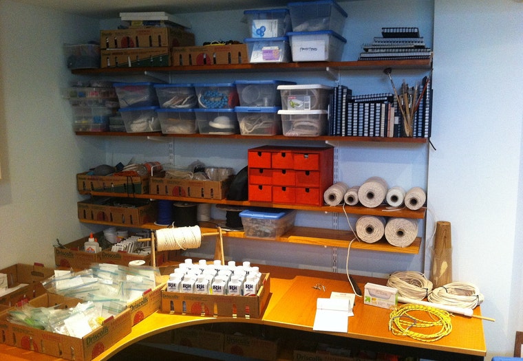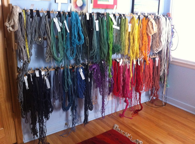 The laundry room is cluttered with milk jugs filed with dye solutions. My scrap box is filled with cut off ends of cord from building the knot bracelets which leads to another opportunity: The fiber+design series...