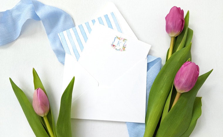 My designs generally are not intended to be monogrammed. Creating a symmetrical, balanced three letter monogram requires additional design work that is not part of the service I offer in creating personalized stationery. You may choose to use initials on your stationery; the exact text you input in the personalization box is what is used in creating your personalized product, and it will be formatted as you see in the example photos (i.e. all caps, upper and lower case, etc.). You can check out our single letter monogrammed crest stationery sets if you are intent on having a monogrammed design.