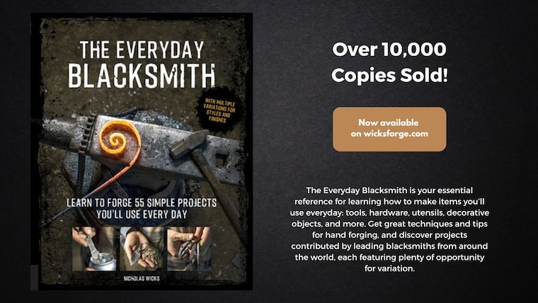 If you're interested in getting into blacksmithing yourself, check out my book: The Everyday Blacksmith. It's your essential reference for learning how to make items you’ll use every day: tools, hardware, utensils, decorative objects, and more. Get great techniques and tips for hand forging, and discover projects contributed by leading blacksmiths from around the world, each featuring plenty of opportunity for variation. Available on Amazon or at wicksforge.com.