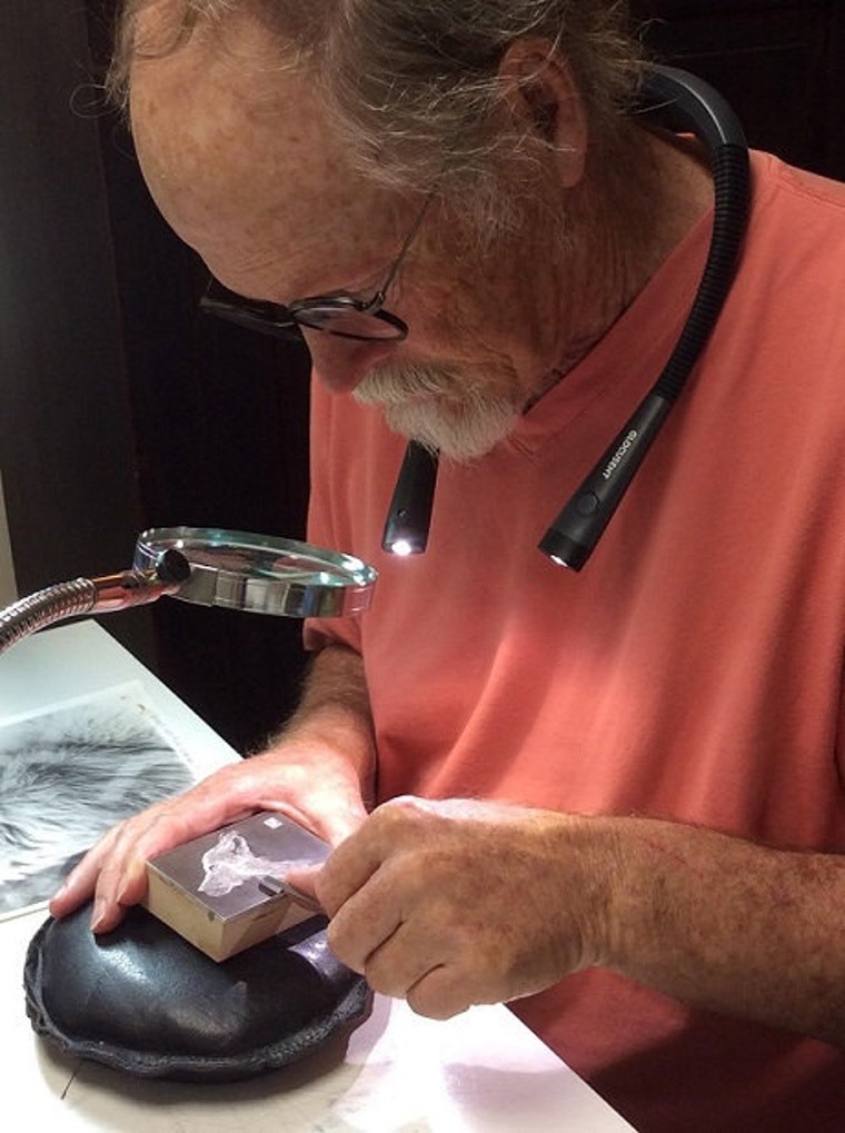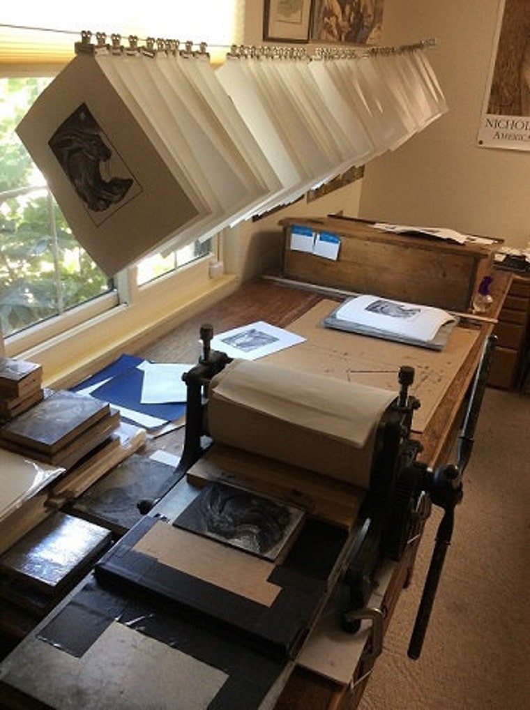 In addition to gouache, oils, watercolors and bronze sculpture this artist has been busy creating copperplate etchings and wood engravings. Currently, his wood engravings are being exhibited in the England where he is a member of the Society of Wood Engravers, Berlin and Denmark. Mr. Wilson’s etchings and wood engravings are in permanent collection at the