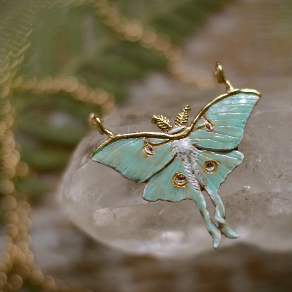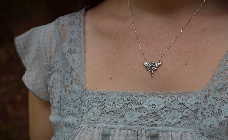 Whimsical woodland jewelry | Original hand-sculpted designs, sustainably cast in the USA with recycled metals. | Fox & Luna Moth necklaces | Personalized glass Sunflower & Rose terrarium pendant necklaces | Twig Hair Bobby Pins