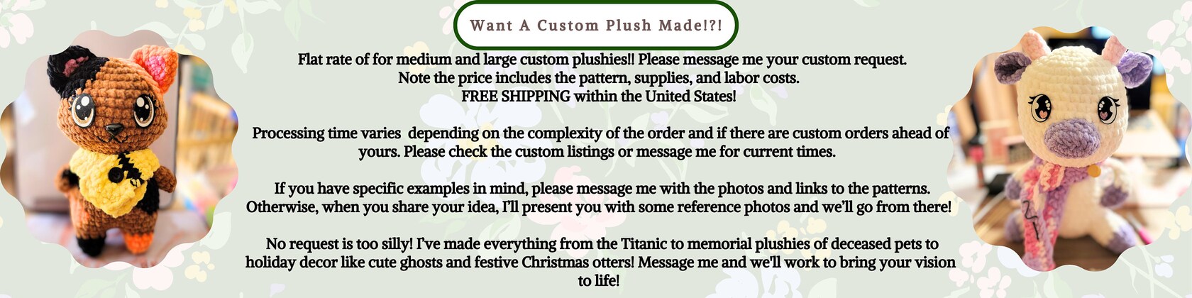 I’m definitely not finished growing my business either! Here, you’ll be able to find all my crochet patterns and my finished makes! You can even purchase your very own custom plushie made by yours truly!
