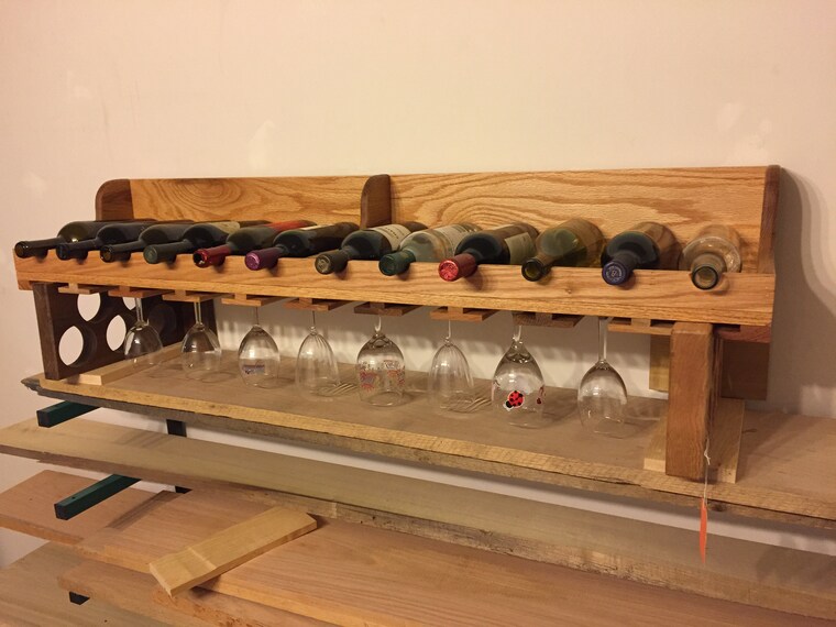 Custom horizontal bar back in oak. 48" long holds 12 bottles and 36 glasses
