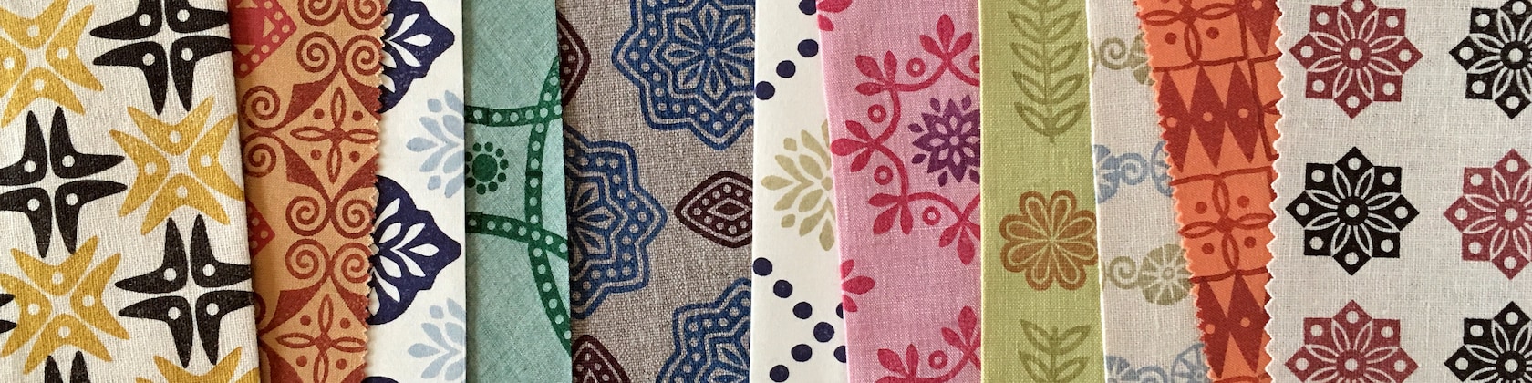 I started my shop with the idea of selling my own small swatches of hand printed and dyed fabric. I backed most of the swatches in paper so they could be used as book cloth. It was a very elaborate process which I soon decided could not be a part of a practical business plan! After quite a bit of soul searching, I decided my true love and strength was designing the individual motifs and seeing how they worked in repeating patterns.