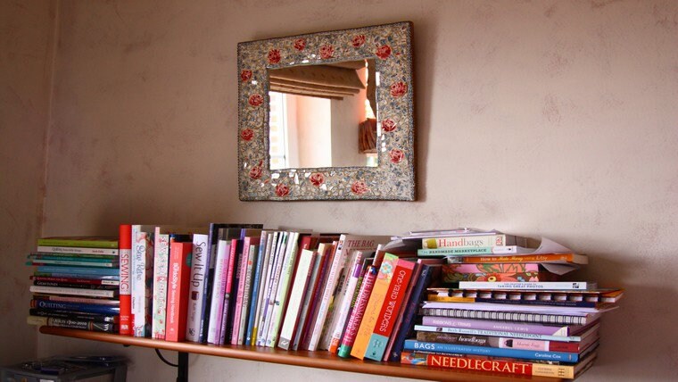 A corner of my sewing space, with my books and a handmade mirror, found in the south of France while on holiday. -