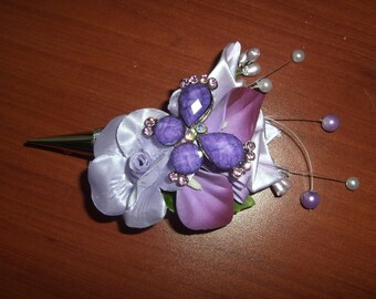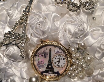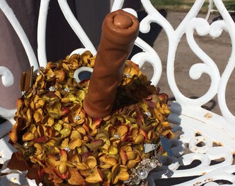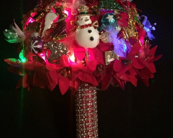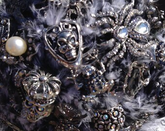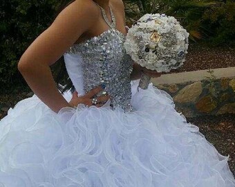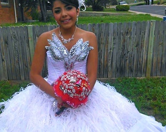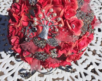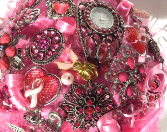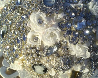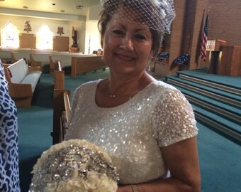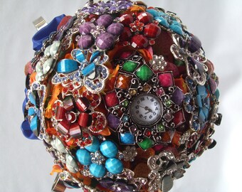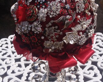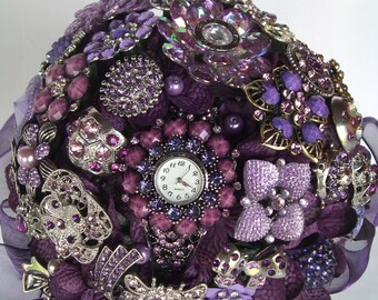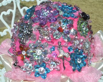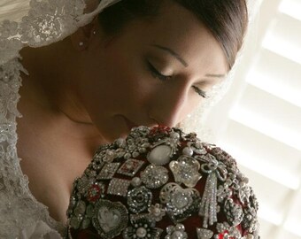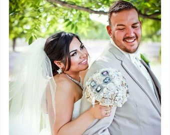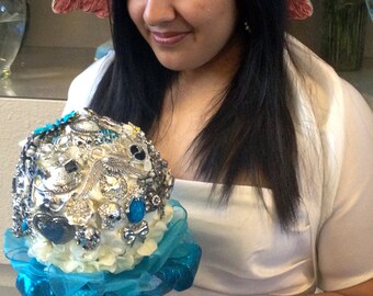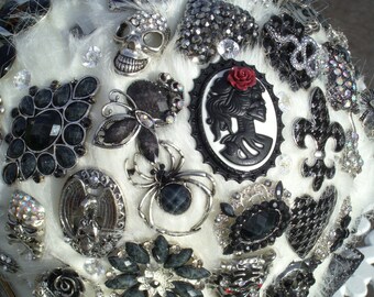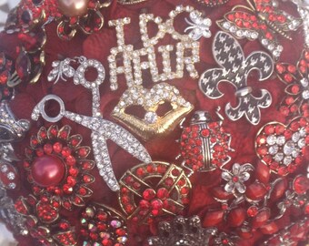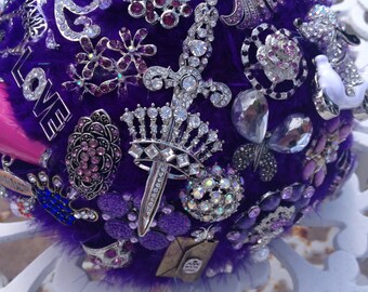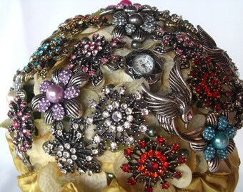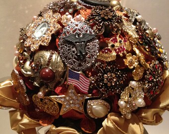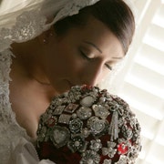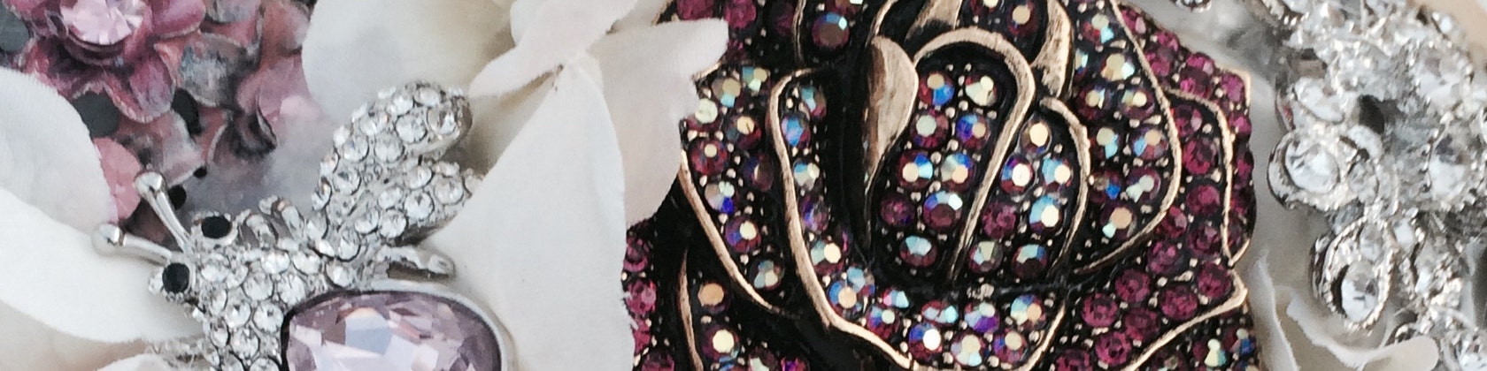 I got started because I needed a de-stresser in my life. My career is in nursing and it is very full filling but at times the stress was exhausting. My Son was planing his wedding when I saw this beautiful Brooch Bouquet. I told them I wanted to make the bouquet for them with no obligation to use it if they were'nt pleased with it. So I started working on his soon to be brides bouquet. I built it up and torn it down five different time until finally I was pleased with my first Brooch Bouquet. I made it different in that I placed a time piece in the bouquet with a sliver strand that would be pulled at the time of their I Do's at the alter to stop that very moment. This became my signature. I also personalized it by adding pieces that told their story. When they were dating they would go up on the roof with a blanket and star gaze. So I added a brooch that looked like a shooting star. He was a police officer, so I added a brooch of cuffs and guns. They loved to ride on the motorcycle so the time piece was of a motorcycle. The first gift he gave her was a puppy, so of course I found a brooch of a puppy and added it. Many of the brooches were pieces that told their story. I believe that is the reason I have been successful. People love to look at the bouquet and see their love story. Needless to say it is the most beautiful thing to be in-trusted with their most precious moments. As I read their love story and start to locate brooches that tell their story I am filled with peace. I come home from a stressful day at work and look forward to thinking happy thoughts as I create a bouquet that will be treasured for-ever. Since that first bouquet I have had bouquets returned to me for the soul purpose of continuing their story. As they purchase their first home or have the first child new brooches, like a home or pacifier are added to the bouquet. I have been told how the bouquet serves as a centerpiece and others have used it as a conversation piece to see who can tell their love story by looking at the pieces on the bouquet.