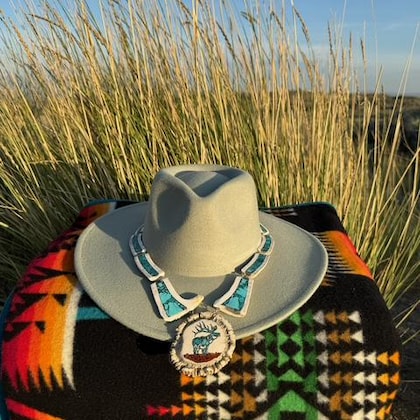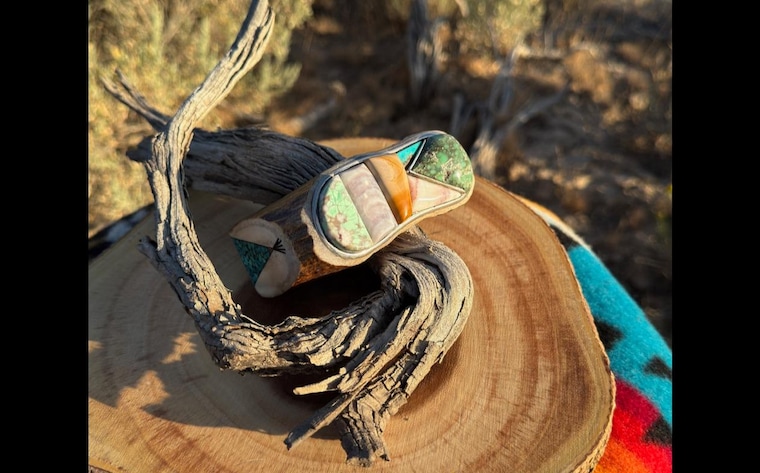 Years ago I started adding turquoise inlay to the handles of my stone blade knives. Soon after I had a Collector ask me for a antler pendant to match the handle of his knife. My journey on this new style of antler inlay was formed.