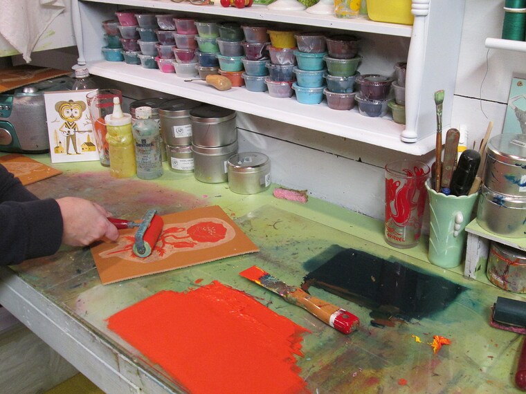 Mixing up ink and ready to print a block. Prints are then turned into screens and hand printed. -