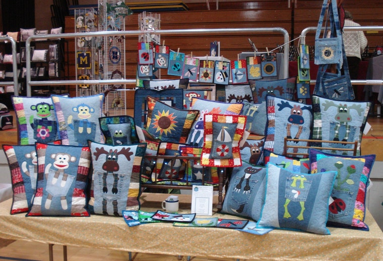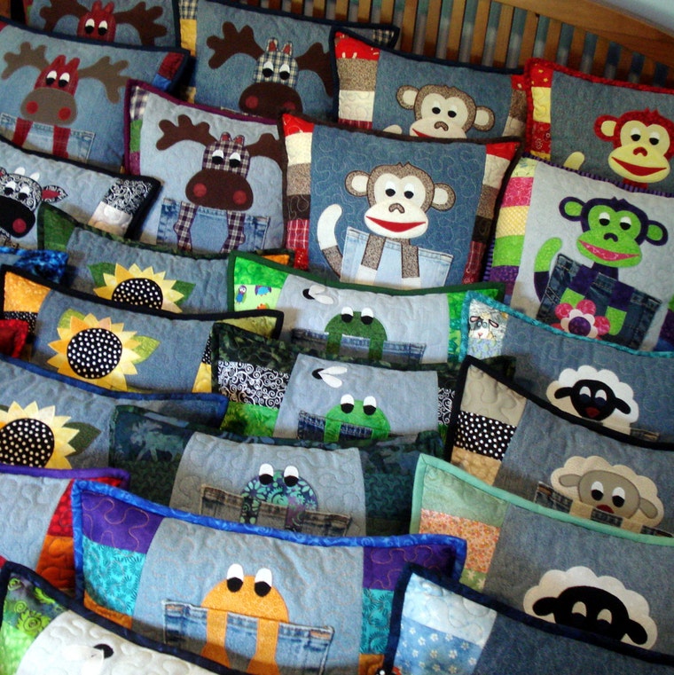 Lining pillows up to get priced and ready for a show. Don't they just make you smile! -