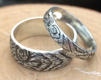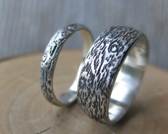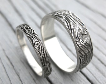 Wood grain OAK wedding band SET sterling silver wood grain matching rings faux bois Made to Order mens womens