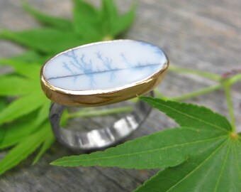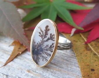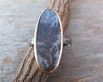 Branch Dendrite 14kt gold bezel dendritic agate woodgrain ring sterling silver ring size 6 ready to ship