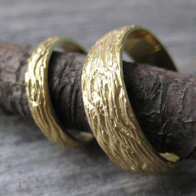 Wood grain OAK wedding band SET 14 kt yellow GOLD wood grain matching rings faux bois Made to Order mens womens