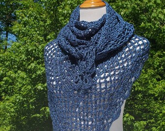 Shimmering blue wrap, crochet shawl, openwork lace shawl, Victorian lace shawl, bridesmaids wrap, summer wedding wrap, metallic blue shawl