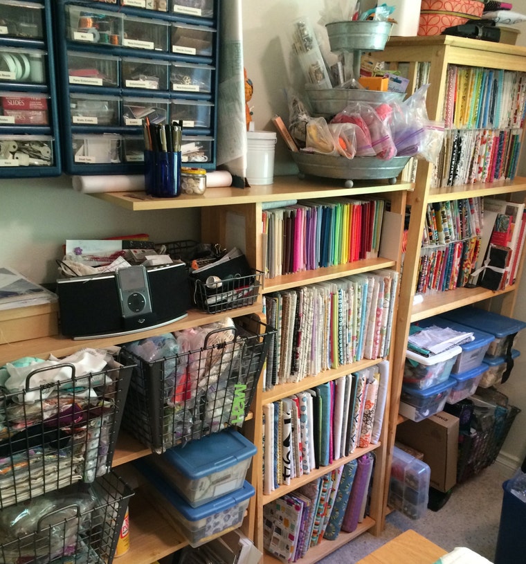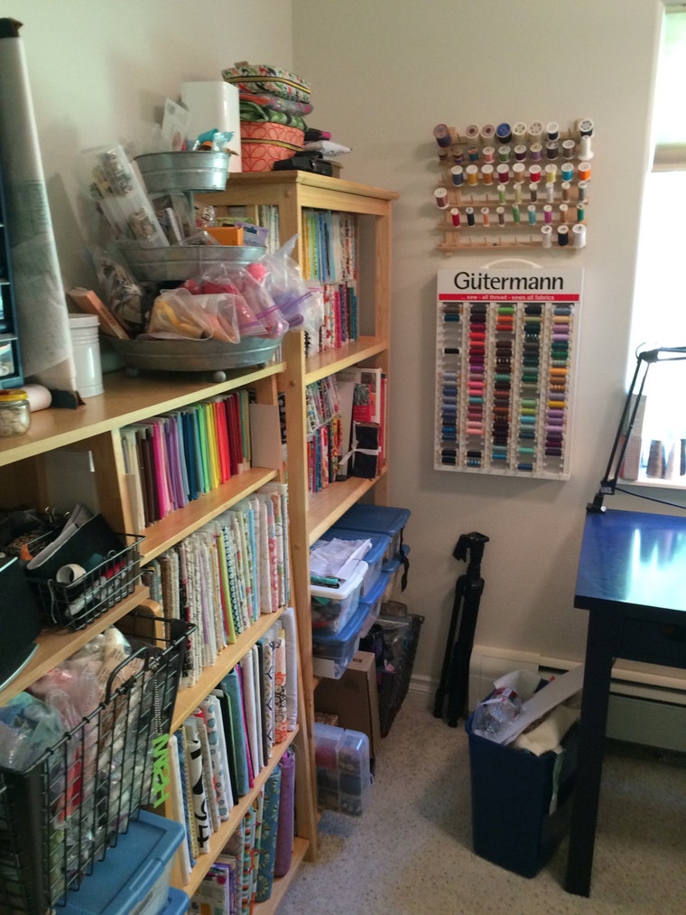 One wall of my studio is filled with fabric, beads, buttons, ribbon and found objects -