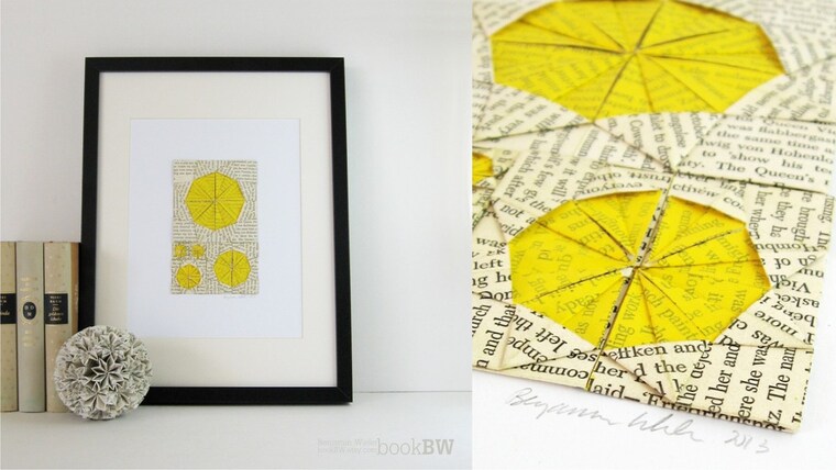 I have always been involved in the arts and I like books as an artist's material as well. I'm constantly exploring origami techniques to find shapes by folding entire books or just individual pages. I find it funny to produce an installation of paper cogs that I have made with Shakespeare's plays and Harlequin romance novels. The story lines are very similar: romance, tragedy, love and/or death, then curtain!