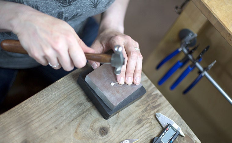 Hammering earrings in the studio. -