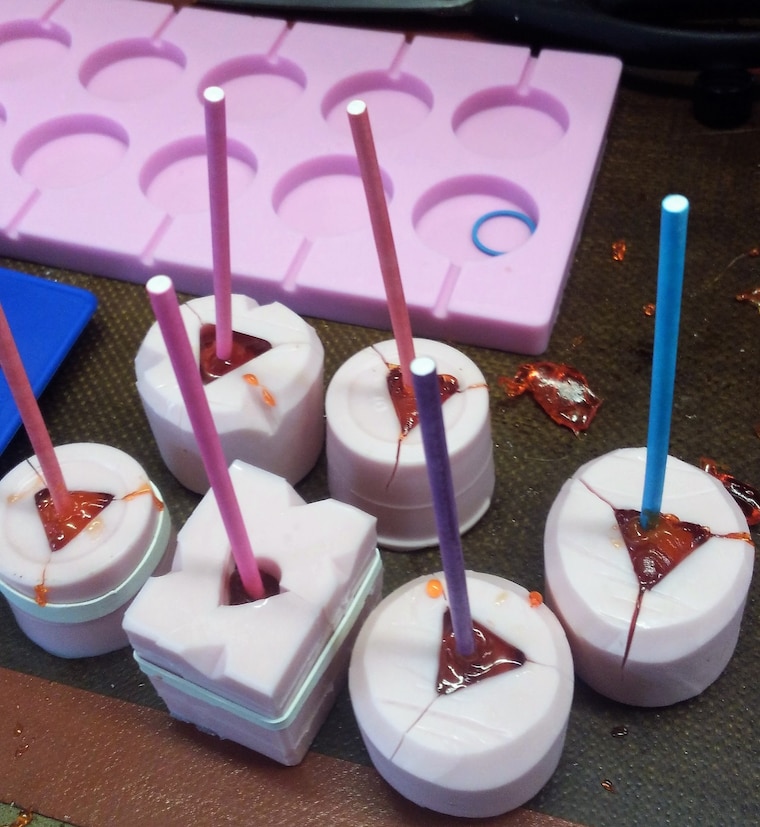 Pouring 310 degree melted hard candy into the food grade silicone molds I made. -