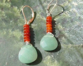 Aventurine + Carnelian Drop Earrings - Genuine Gemstones + Sterling Silver Lever Back Hooks - Natural Gemstones