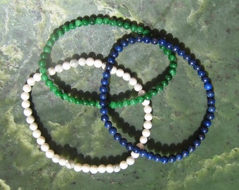 Trio of Mini Bracelets - Dry Green Jasper Lapis Howlite - Genuine Gemstones + Latex-Free Elastic Floss - Natural Gemstones
