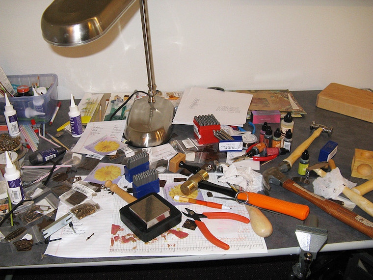 Separate table for metal stamping and solder work. Still another area for painting and embossing. Soon the entire house. -