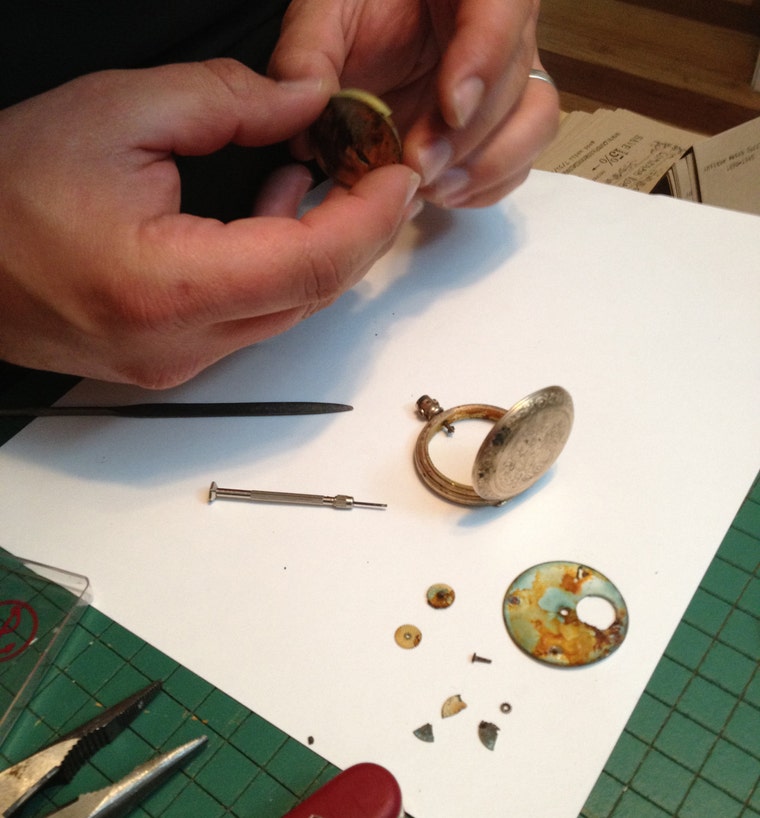 I've been making jewelry and stained glass for the last fifteen years with vintage and found treasures. Collecting from family members and flea markets has been a lifelong tendency. I took apart my first stereo at age 7 and my first broken pocket watch at 9. In both cases, my goal was repair, but upon seeing the beautiful parts, I changed my mind Both my father and grandfather were dentists who crafted jewelry as a hobby - I still use some of their tools.