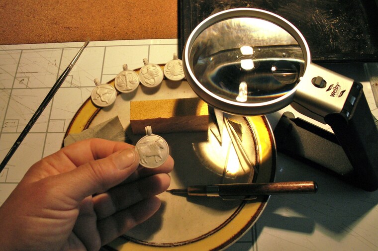 finishing touches on my fine silver zodiac pendanst before firing -