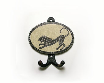 wall hook handmade mosaic with ceramic black and beige tiles 5mm ( 5,12 in x 5,51 in ) - black lion