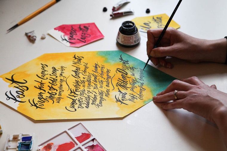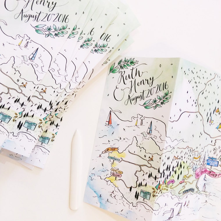 Essentially this is where the journey started. The plan was to make everything that we could for our summer wedding! And we did! We wanted invitations that were more of a gift and memory for us, our family and friends. I couldn't find anything that suited us and so I illustrated, screen printed and painted our invitations, and all our other stationery pieces. I cut large table numbers and put them in old green and blue bottles filled with flowers. Soon after the wedding, there was an over whelming amount of compliments.