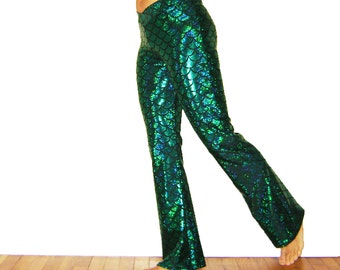 Mermaid Flare Pants Dragon Fish Scale Holographic Merman Ariel Halloween Triton Women's Men's Green Turquoise Dancing Tree Creations