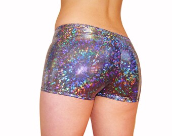 Holographic Booty Shorts, Burningman, Hot Pants, Valentines Halloween EDC Shiny Hologram Dancing Tree Silver, White, Carnaval, Roller Derby