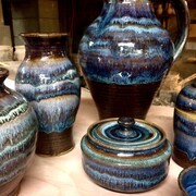 As a youth I spent my early years charging across the dusty floor boards of my grandfather's pottery studio. For the gang of us, my cousins, my sister, and myself, the "pot shop" was a den for mischief and occasional skirmishes involving projectile nuggets of soft clay. Slathering ourselves, and each other, with those cold wet gobs was the extent of our interests in ceramics at that time. My grandfather, Jack O'leary, had been a founding member of the New Hampshire Crafts Guild and the thriving New England craft community in the 1950's and 60's. It was a family business, and while our uncles tolerated our shenanigans (and tried to enlist us in pugging clay)we eventually drifted away, rejecting the life of mud and dust. It wasn't until years later that I discovered the magic of this craft and attempted to embrace my lineage. In these times of shifting sensibilities and economic anxieties, I find a rootedness, a heartiness and dependibility, in this earthly endeavor. Feeling the wet clay rise in my hands as the wheel spins relaxes me,relieves me of my own anxieties. When I am creating pots in my studio, I strive to bring spontaneity and life to the process of working with clay.