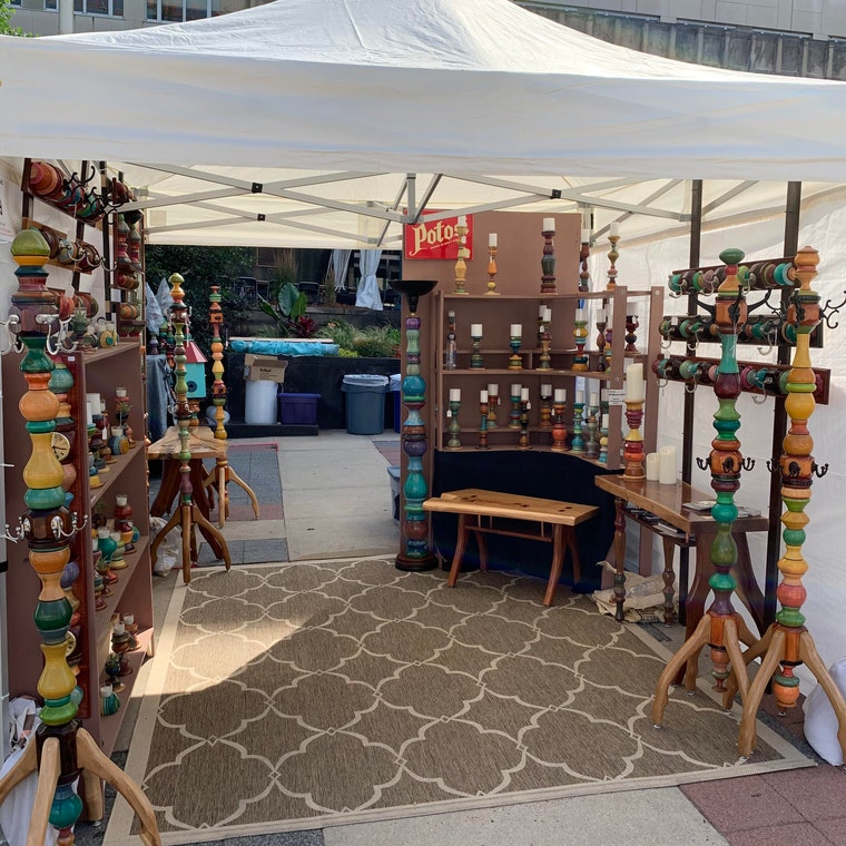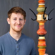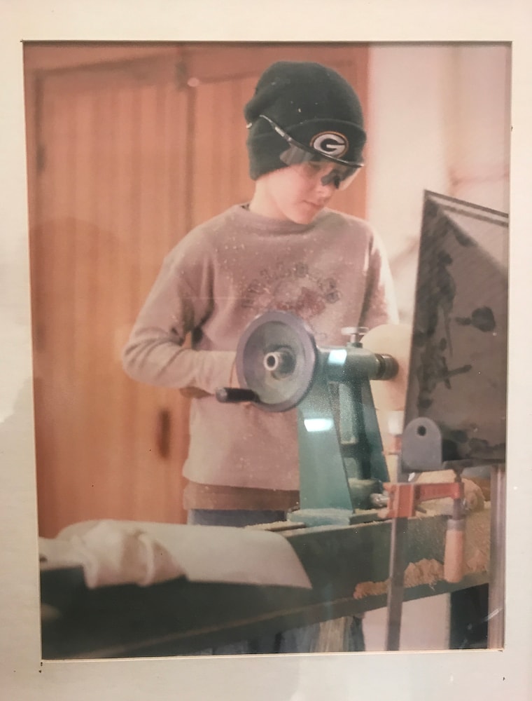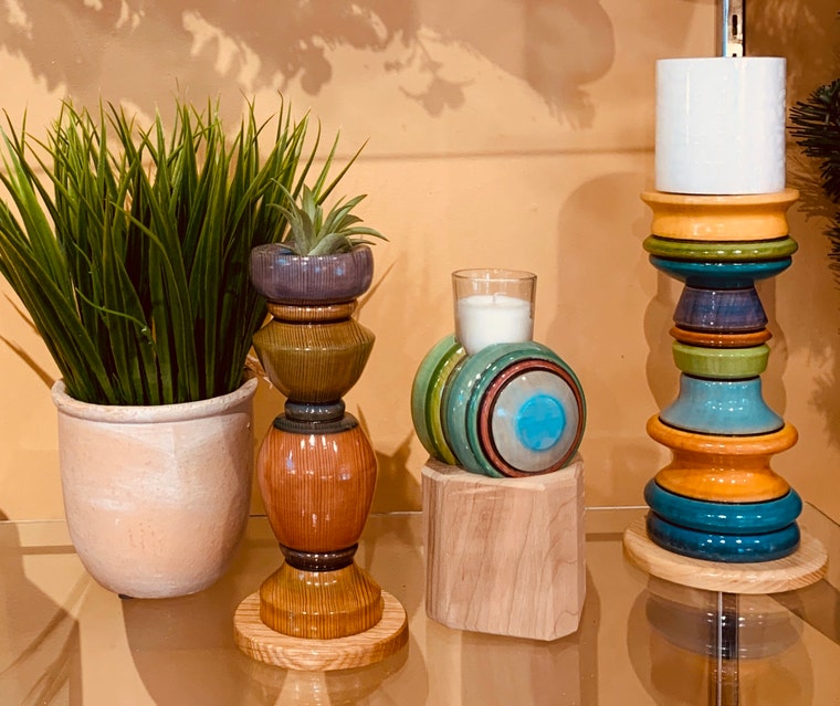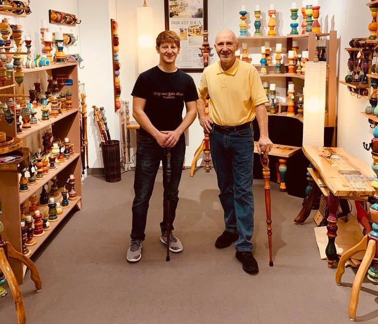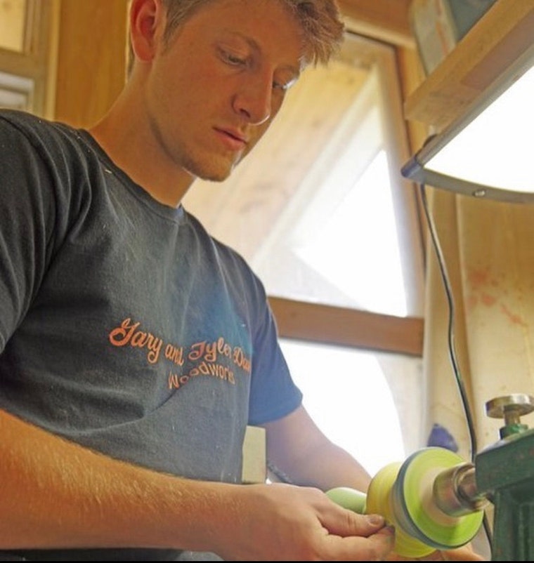 When Tyler David was 11 years old he came across a discovery in his dad’s woodworking shop. Tyler was turning a spindle on the lathe, he then found lumber crayons in the shop and started experimenting with them on the wood. Tyler applied the crayon to the wood and discovered that using a rag on the spinning wood blended it evenly. This action created friction and melted the wax from the crayon into the wood, leaving a smooth and permanent pigment into the wood. He continued to make these colored spindles on the lathe and eventually adapted the spindles into functional candleholders. Over time these candleholders proved to be quite popular, leading Tyler and his father Gary to enter into business together. They now create a wide variety of home décor and furniture pieces. The money Tyler has made from selling his work has put him through college at the University of Wisconsin Platteville, receiving a bachelors degree from the school of business. Now that Tyler is a 21 year old recent college graduate he is in full force of promoting and expanding his woodworking business. By selling at multiple successful galleries and attending craft shows nationwide, Gary and Tyler are continuously exited watching their business evolve and grow.