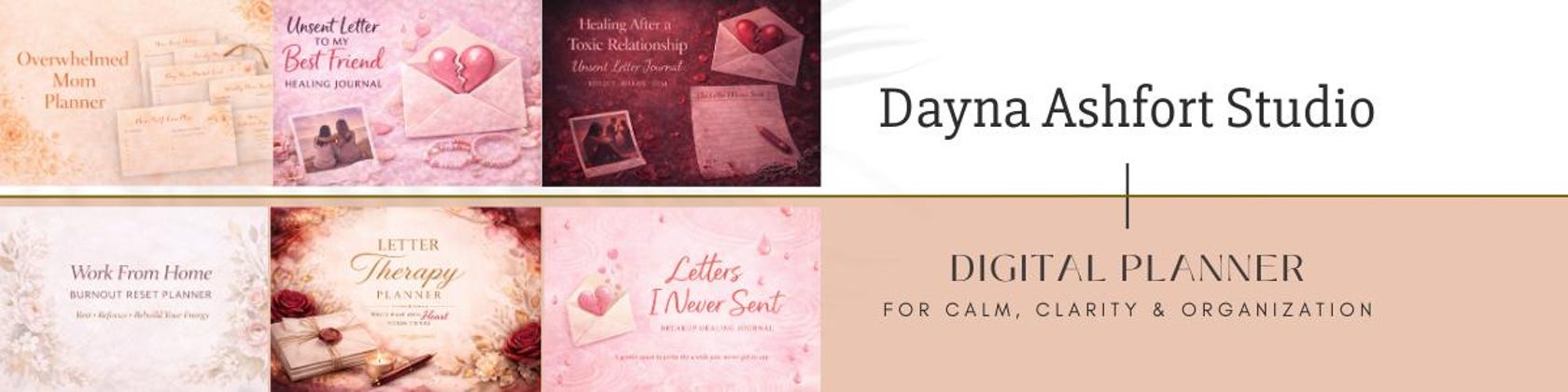 Welcome to Dayna Ashfort Studio ✨ I create beautiful digital planners, journals and workbooks designed to help you build better habits, practice self-love and create a life you truly love. Thank you for being here and supporting my small shop. 🤍