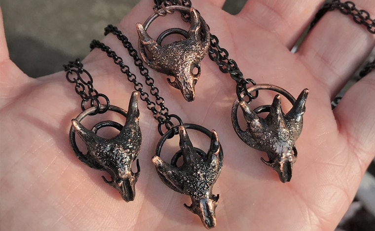 A selection of copper pendants, these "Dragon Skulls" feature tiny mouse skulls with mink teeth used as the horns. -