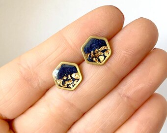 Blue Hexagon Earrings- Gold and blue geometric studs- Delicate gold dipped posts - elegant everyday earrings