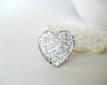 Silver glitter heart ring- Statement sparkling cocktail ring- Elegant gift for her- Under 20