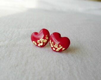 Red and gold heart post earrings- Delicate Valentine's Day jewelry- Cute feminine stud earrings